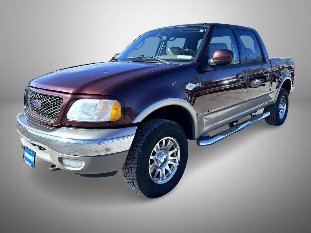 Red 2003 Ford F-150 King Ranch 4WD 4-Speed Automatic with Overdrive 5.4L V8 5.4L V8, 4WD, 3.73 Axle Ratio, 4 Speakers, 4-Wheel ABS/4-Wheel Disc Brakes, 4-Wheel Disc Brakes, 40/60 Split Fold-Down Rear Seat, ABS brakes, Adjustable pedals, Air Conditioning, AM/FM radio, Bodyside moldings, Bumpers: chrome, Cargo Light Integrated w/High Mount Stoplight, CD player, Chrome Rear Step Bumper, Color Keyed Carpeting, Compass, Driver door bin, Driver vanity mirror, Dual front impact airbags, Fail-Safe Cooling, Fog Lamps, Front anti-roll bar, Front Center Armrest w/Storage, Front fog lights, Front reading lights, Front wheel independent suspension, GVWR: 6,500 lbs Payload Package, Illuminated entry, Integrated Rear Child Seat Tethers, Leather steering wheel, Lower Anchors & Tethers for Children, Outside temperature display, Overhead console, Panic alarm, Passenger door bin, Passenger vanity mirror, Pioneer Dual Media Radio, Power Adjustable Driver's Pedals, Power Door Locks, Power door mirrors, Power Driver's Seat, Power steering, Power Windows, Power windows, Radio data system, Rear Privacy Glass Windows, Rear reading lights, Rear step bumper, Remote Keyless Entry, Remote keyless entry, SecuriLock, Speed control, Speed Control w/Tilt Steering Wheel, Speed-Sensitive Wipers, Split folding rear seat, Tachometer, Tilt steering wheel, Tow Hooks, Variably intermittent wipers, Voltmeter, 5.4L V8, 4WD.
