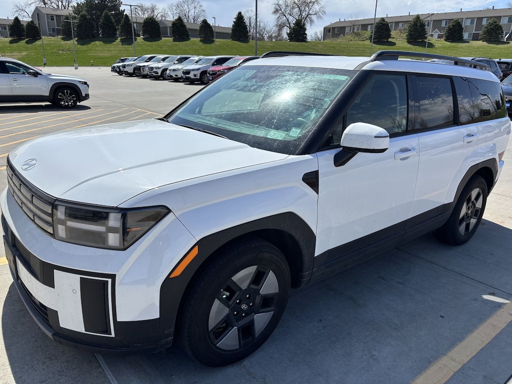 Serenity White 2025 Hyundai Santa Fe Hybrid SEL AWD 6-Speed Automatic with Shiftronic 4 cylinder 4 cylinder, 18" x 7.5J Alloy Wheels, 3rd row seats: bench, 4-Wheel Disc Brakes, 6 Speakers, ABS brakes, Air Conditioning, Alloy wheels, AM/FM radio: SiriusXM, Apple CarPlay & Android Auto, Auto High-beam Headlights, Automatic temperature control, Brake assist, Bumpers: body-color, Delay-off headlights, Driver door bin, Driver vanity mirror, Dual front impact airbags, Dual front side impact airbags, Electronic Stability Control, Emergency communication system, Exterior Parking Camera Rear, Four wheel independent suspension, Front anti-roll bar, Front Bucket Seats, Front Center Armrest, Front dual zone A/C, Front reading lights, Fully automatic headlights, H-Tex Leatherette Seat Trim, Heated door mirrors, Heated Front Bucket Seats, Heated front seats, Illuminated entry, Knee airbag, Leather steering wheel, Low tire pressure warning, Occupant sensing airbag, Option Group 01, Outside temperature display, Overhead airbag, Overhead console, Panic alarm, Passenger door bin, Passenger vanity mirror, Power door mirrors, Power driver seat, Power Liftgate, Power steering, Power windows, Radio: AM/FM/HD Display Audio, Rear anti-roll bar, Rear seat center armrest, Rear side impact airbag, Rear window defroster, Rear window wiper, Remote keyless entry, Security system, Speed control, Speed-sensing steering, Split folding rear seat, Spoiler, Steering wheel mounted audio controls, Tachometer, Telescoping steering wheel, Tilt steering wheel, Traction control, Trip computer, Turn signal indicator mirrors, Variably intermittent wipers, 4 cylinder.