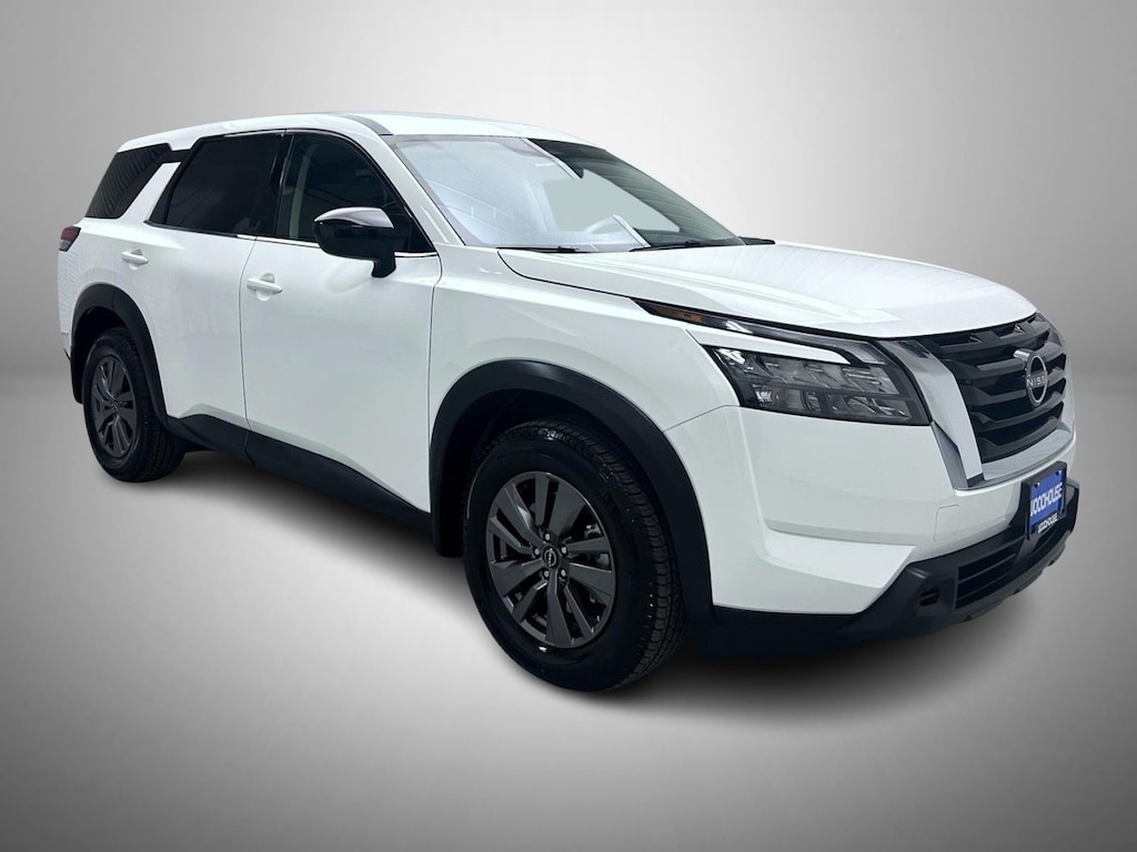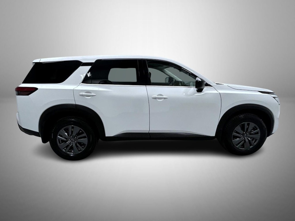 Glacier White 2025 Nissan Pathfinder S 4WD 9-Speed Automatic 3.5L 6 cylinder 4WD, 3rd row seats: bench, 4-Wheel Disc Brakes, 6 Speakers, ABS brakes, Air Conditioning, Alloy wheels, AM/FM radio: SiriusXM, Auto High-beam Headlights, Automatic temperature control, Bench Seat Carpeted Floor Mats (set of 4), Black Splash Guards (set of 4), Blind Spot Warning, Brake assist, Bumpers: body-color, Cloth Seating Surfaces, Delay-off headlights, Driver door bin, Driver vanity mirror, Dual front impact airbags, Dual front side impact airbags, Electronic Stability Control, Four wheel independent suspension, Front anti-roll bar, Front Bucket Seats, Front Center Armrest, Front dual zone A/C, Front reading lights, Fully automatic headlights, Illuminated entry, Knee airbag, Low tire pressure warning, NissanConnect featuring Apple CarPlay and Android Auto, Occupant sensing airbag, Outside temperature display, Overhead airbag, Overhead console, Panic alarm, Passenger door bin, Passenger vanity mirror, Power door mirrors, Power steering, Power windows, Radio data system, Radio: AM/FM Audio System with NissanConnect, Rear air conditioning, Rear anti-roll bar, Rear Parking Sensors, Rear reading lights, Rear side impact airbag, Rear window defroster, Rear window wiper, Reclining 3rd row seat, Remote keyless entry, Security system, Speed control, Speed-sensing steering, Split folding rear seat, Spoiler, Steering wheel mounted audio controls, Tachometer, Telescoping steering wheel, Tilt steering wheel, Traction control, Trip computer, Variably intermittent wipers, Wheels: 18" x 8J Painted Alloy, 4WD.