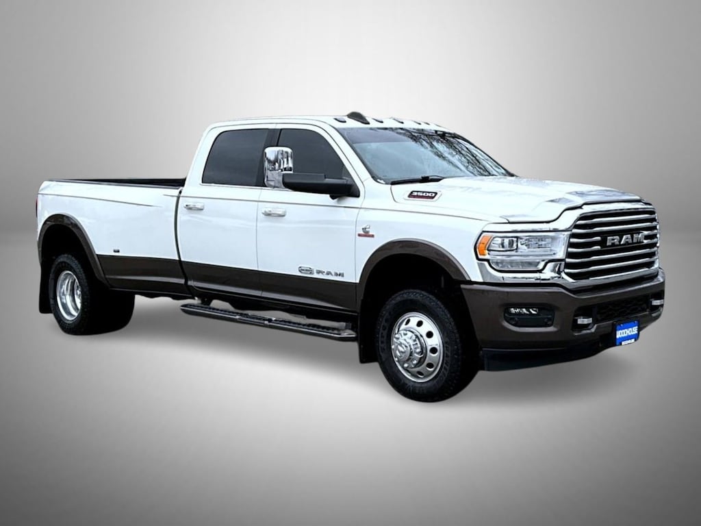 Pearl White 2022 Ram 3500 Laramie Longhorn 4WD Aisin 6-Speed Automatic 6.7L 6 cylinder 10 Speakers, 115V Auxiliary Rear Power Outlet, 12" Touchscreen Display, 17 Speaker harman kardon Premium Sound, 2 Way Rear Headrest Seat, 220 Amp Alternator, 3.73 Axle Ratio, 4 Way Front Headrests, 4-Wheel Disc Brakes, 4G LTE Wi-Fi Hot Spot, 50 Gallon Fuel Tank, 5th Wheel/Gooseneck Towing Prep Group, 6000# Front Axle w/Hub Ext, 8.4" Touchscreen Display, ABS brakes, Active Noise Control System, Adaptive Steering System, Adjustable pedals, Air Conditioning, Alexa Built-In, All R1 High Radios, All Radio Equipped Vehicles, Alloy wheels, AM/FM radio: SiriusXM with 360L, Apple CarPlay, Apple CarPlay/Android Auto, Audio memory, Auto High-beam Headlights, Auto-dimming Rear-View mirror, Automatic temperature control, Blind Spot & Cross Path Detection (DISC), Box & Rear Fender Clearance Lamps, Brake assist, Bucket Seats, Bumpers: chrome, Center Hub, Chrome Flat Cab-Length Side Steps, Chrome Tow Hooks, Clearance Lamps, Cold Weather Group, Compass, Connected Travel & Traffic Services, Connectivity - US/Canada, CTR Stop Lamp w/Cargo View Camera, Dash Pass Thru Wire Circuits, Delay-off headlights, Disassociated Touchscreen Display, Driver door bin, Driver vanity mirror, Dual Alternators Rated At 440 Amps, Dual front impact airbags, Dual front side impact airbags, Dual Rear Wheels, Electronic Stability Control, Electronically Controlled Throttle, Engine Block Heater, Folding Flat Load Floor Storage, For Details Visit DriveUconnect.com, For More Info, Call 800-643-2112, Front anti-roll bar, Front Bucket Seats, Front Center Armrest w/Storage, Front dual zone A/C, Front fog lights, Front License Plate Bracket, Front reading lights, Front Seat Back Map Pockets, Full Length Premium Upgraded Floor Console, Fully automatic headlights, Garage door transmitter, Genuine wood console insert, Genuine wood dashboard insert, Genuine wood door panel insert, Global Telematics Box Module (TBM), Google Android Auto, GPS Antenna Input, GPS Navigation, HD Radio, Heated door mirrors, Heated Front Seats, Heated front seats, Heated rear seats, Heated Second Row Seats, Heated Steering Wheel, Heated steering wheel, High Back Seats, I/P Mounted Auxiliary Switches, Illuminated entry, Integrated Center Stack Radio, Integrated Voice Command w/Bluetooth, Leather steering wheel, Longhorn Level 1 Equipment Group, Low tire pressure warning, Manufacturer's Statement of Origin, Memory seat, MOPAR Deployable Bed Step, MOPAR Winter Front Grille Cover, Navigation System, Occupant sensing airbag, Off-Road Information Pages, Outside temperature display, Overhead airbag, Overhead console, Painted Flat Cab-Length Side Steps, Panic alarm, ParkView Rear Back-Up Camera, Passenger door bin, Passenger vanity mirror, Pedal memory, Power 8-Way Adjustable Passenger Seat, Power Adjust 8-Way Driver Seat, Power Deployable Running Boards, Power door mirrors, Power driver seat, Power passenger seat, Power steering, Power Sunroof, Power windows, Premium Filigree Leather Seats, Protection Group, Quick Order Package 21K Longhorn, Radio data system, Radio: Uconnect 5 Nav w/12.0" Display, Radio: Uconnect 5 Nav w/8.4" Display, Rain sensing wipers, Ramcharger Wireless Charging Pad, Rear 60/40 Folding Seat, Rear reading lights, Rear seat center armrest, Rear step bumper, Rear window defroster, Remote keyless entry, Security system, Selectable Tire Fill Alert, SiriusXM Radio Service, SiriusXM Satellite Radio, SiriusXM w/360L, Speed control, Split folding rear seat, Steering wheel mounted audio controls, Surround View Camera System, Tachometer, Tilt steering wheel, Tip Start, Towing Technology Group, Traction control, Trailer Reverse Guidance, Trailer Tire Pressure Monitoring System, Trip computer, Turn signal indicator mirrors, Variably intermittent wipers, Ventilated Front Seats, Ventilated front seats, Voltmeter, Wheels: 17" x 6.0" Premium Aluminum, Wheels: 18" x 8.0" Diamond Cut Face Aluminum.